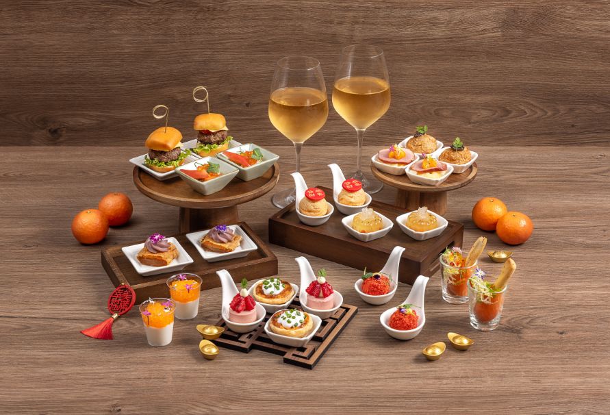 Savour a refined selection of auspicious savoury bites and delicate sweet treats, thoughtfully crafted to honour tradition with a contemporary touch. Enjoy highlights such as Yu Sheng–inspired canapés and Black Truffle Yam Dumplings, complemented by festive sweets including Mandarin Orange Panna Cotta and Layered Nian Gao.