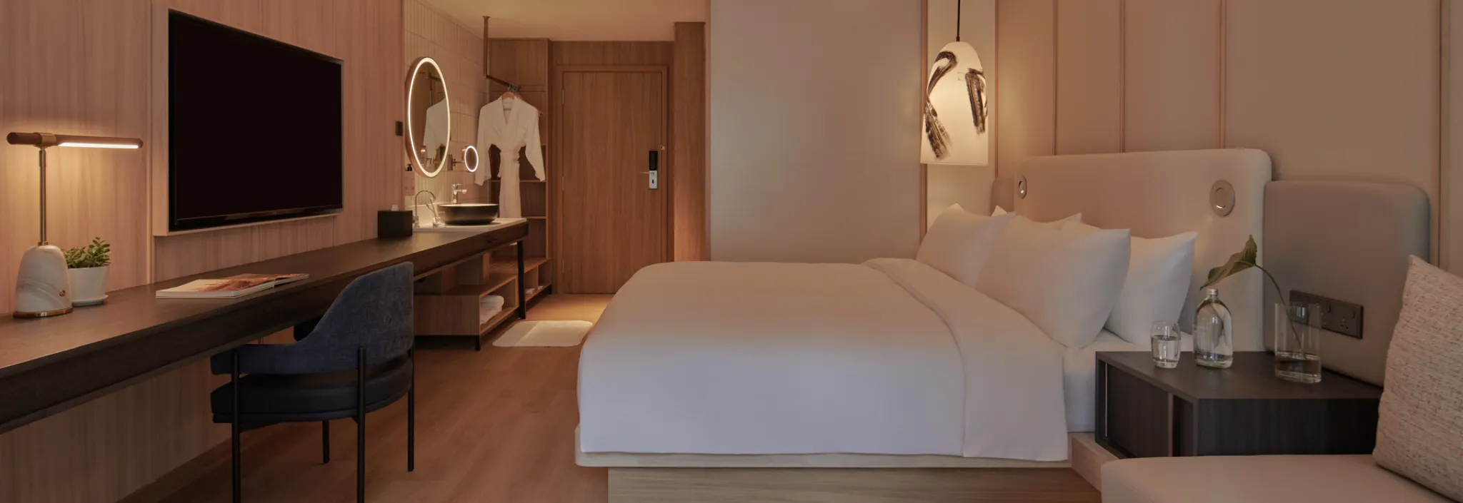Retreat into the cocoon of a snug modern space, with your every need catered to. Sheltered from the bright lights of the city, find respite in rest or bask in warm tones of quiet calm while you refresh yourself for the evening with the lush amenities in the well-appointed bathroom. Otherwise, it is the perfect environment for impromptu work call meetings before heading out for drinks and dinner.